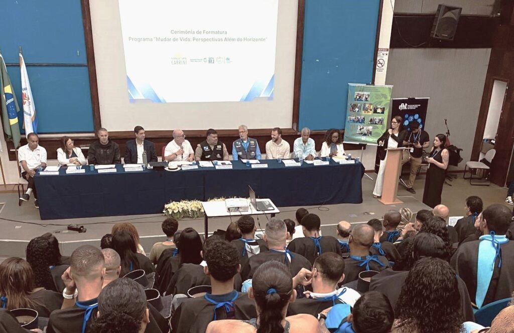 Nesta sexta-feira (18), mais de 40 pessoas em cumprimento de pena receberam certificados durante a cerimônia de formatura do Programa Mudar de Vida: Perspectiva Além do Horizonte, realizada no auditório 11 da Universidade Estadual do Rio de Janeiro (UERJ). A iniciativa qualificou os participantes em cursos como Assistente Administrativo, Auxiliar de Serviços Gerais e no curso Preparatório CEJA, promovendo a reintegração social e o acesso ao mercado de trabalho.